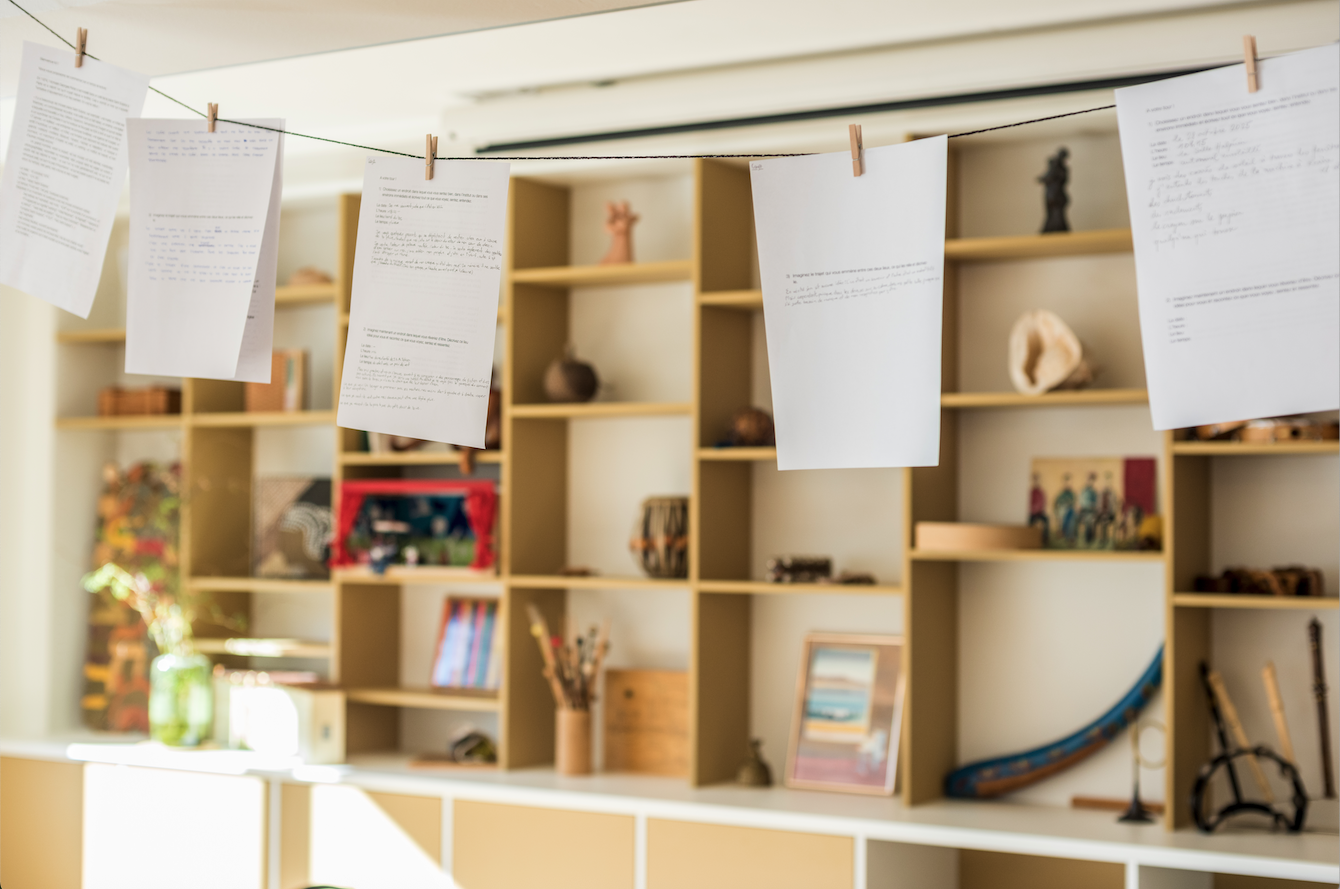 La fin de la journée a réuni les participant·es, autour d’un café-douceur, pour un temps de lecture ouverte. Une sensation de flottement, à l’image des feuilles manuscrites pincées sur des fils comme du linge à sécher, berçait la salle inondée de soleil. Bravant leur timidité, certain·es se sont emparé·es du micro pour lire à voix haute leur texte ou celui d’un·e voisin·e, nous offrant un temps suspendu de rêverie automnale, et la certitude que nous pouvons écrire ensemble.