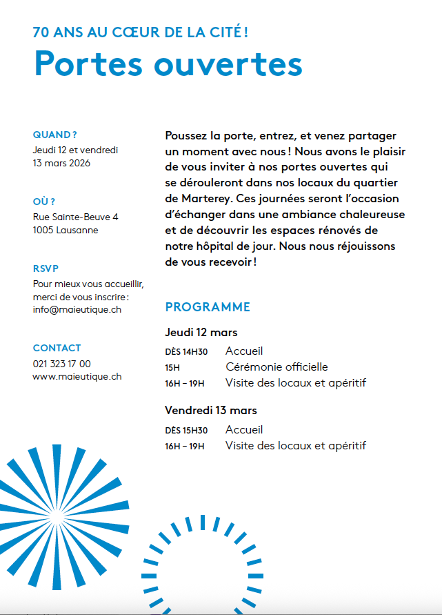 27.02.2026Poussez la porte, entrez, et venez partager un moment avec nous ! Nous avons le plaisir de vous inviter à nos portes ouvertes qui se dérouleront dans nos locaux du quartier de Marterey. Ces journées seront l’occasion d’échanger dans une ambiance chaleureuse et de découvrir les espaces rénovés de notre hôpital de jour. Nous nous réjouissons de vous recevoir !